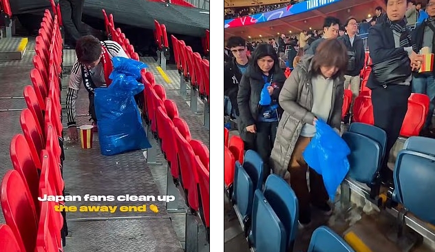 ชนะทั้งในและนอกสนาม! แฟนบอลญี่ปุ่นรับเสียงกึกก้อง โชว์คลาสเก็บขยะเกลี้ยงเวมบลีย์ หลังบุกเชือดอังกฤษ