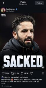ควันหลงหลังการเปลี่ยนแปลงครั้งใหญ่ที่ โอลด์ แทรฟฟอร์ด เมื่อแฟนบอลตาดีสังเกตเห็นว่า อเลฮานโดร การนาโช่ (วัย 21 ปี) ได้ไปกดถูกใจ (Like) โพสต์อินสตาแกรมของ ฟาบริซิโอ โรมาโน่ ที่รายงานข่าวการปลด รูเบน อโมริม